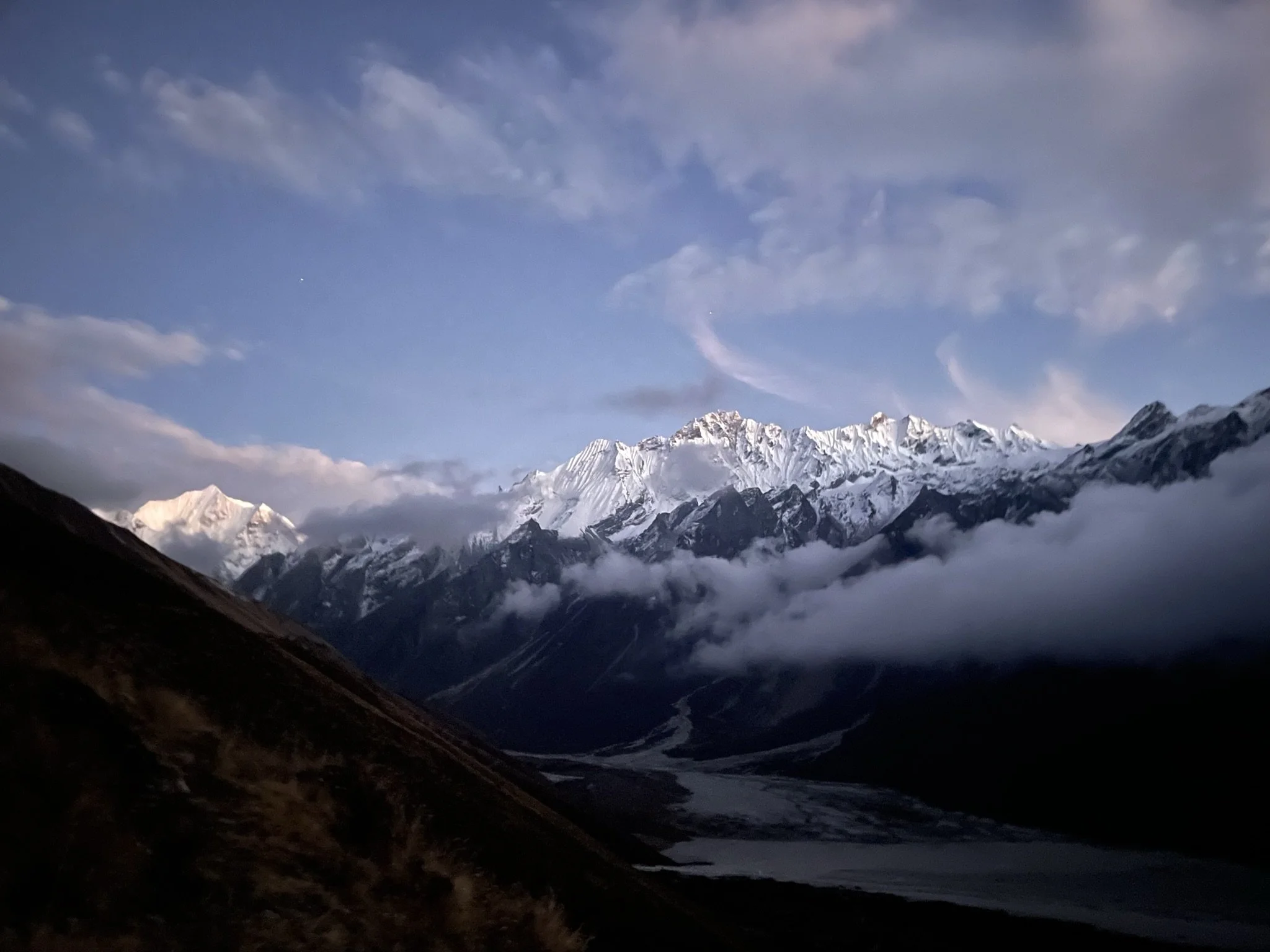 It was becoming clear that this might appeal to others. Meeting and trekking with Tim Calder, trek leader extraordinaire and fluent Nepali-speaker, was instrumental in taking the idea forward. After much planning and excitement we launched our first ‘official’ Yoga-Trek in October 2023. This took us back to the beautiful Langtang Valley on a 12-day adventure, following the Langtang Khola river for the whole length of the trek to see it change from a roaring torrent into glacial ice. En route daily yoga sessions aligned perfectly with trekking, as we practised outdoors against a backdrop of snow-capped peaks.